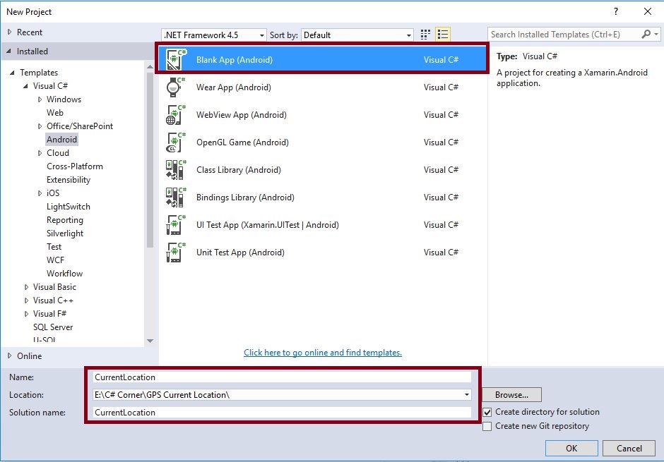 Open Visual Studio, New Project, Templates, Visual C#, Android, then select Blank App (Android),