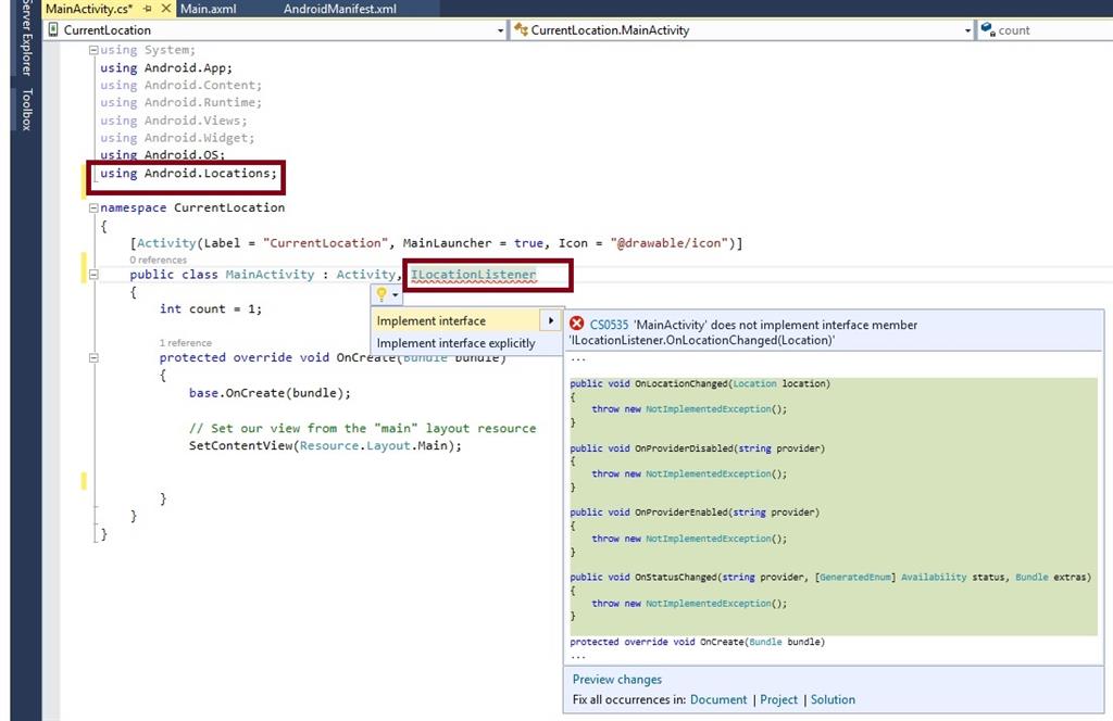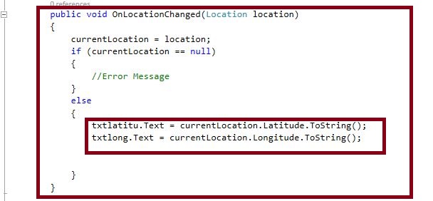 - public class MainActivity: Activity, ILocationListener