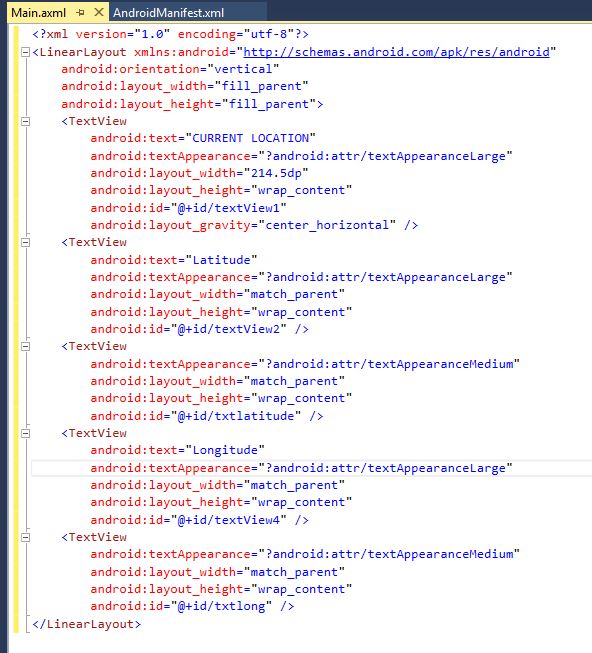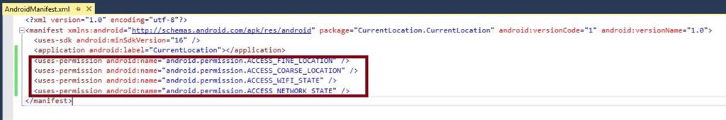 Next go to Solution Explorer-> Project Name->AndroidManifest.xml open xml code and give the Permission for Location, Network, Coarse Location services.