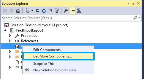 Step 2: Go to Solution Explorer-> Project Name-> Components, right click to Get More Components, open new dialog box. This dialog box is required to search the Design, add Android Support Design Library Packages.