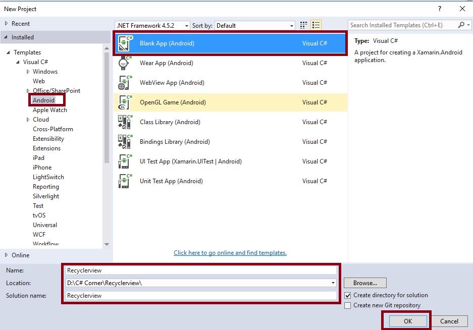 Step 1: Open Visual Studio->New Project->Templates->Visual C#->Android->Blank App.