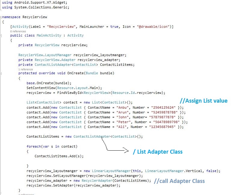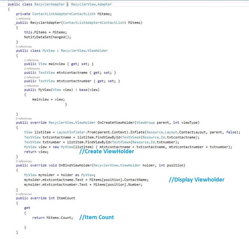 The last step is to end the Oncreate(), to create new RecyclerAdapter class. Here, we declare all variables of ContactList.axml page and then, create ViewHolder for viewing the List view of the items in that Recycler View Adapter,