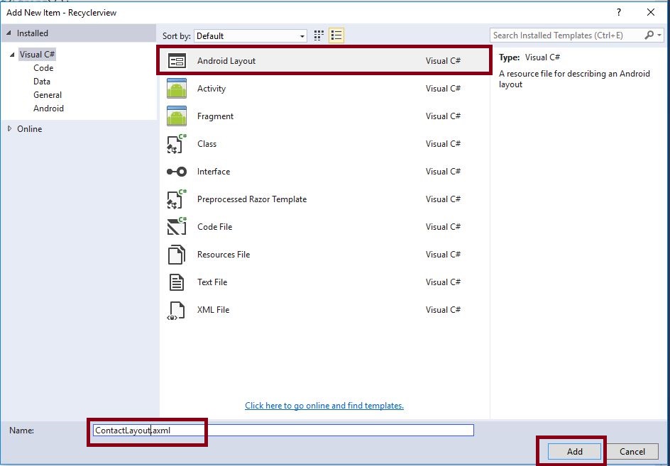 Next, we need to create New Layout for Contact List View. Go to Solution Explorer-> Project Name->Resources->layout. Right click on Add-> New Item; opens a new dialog box. Select Android Layout and name it as ContactLayout.axml.