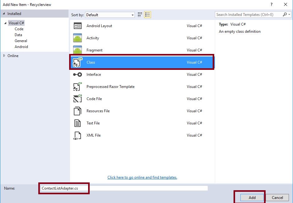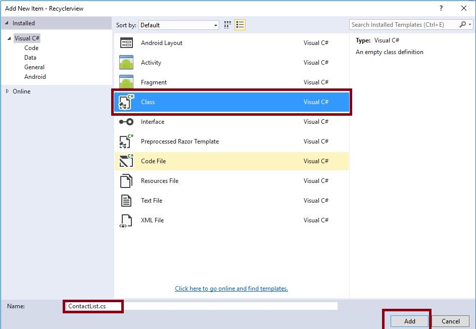 Next step is to create variables, then, declare the variables in OnCreate(), and assign ConatctList<> values. But before this, we need to create Recycler adapter. So, add one more class of ContactListAdapter.cs. Go to Solution Explorer-> Project Name. Right click on Add->New Item. A new dialog box opens. Select Class and give it the name ContactListAdapter.cs.