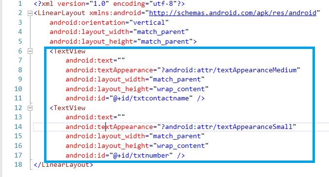 Now, open Solution Explorer-> Project Name->Resources->Layout-> ContactLayout.axml. Click open the Design View and give the following code. Here, we create two textViews, one for Contact Name and another one for Contact Number.