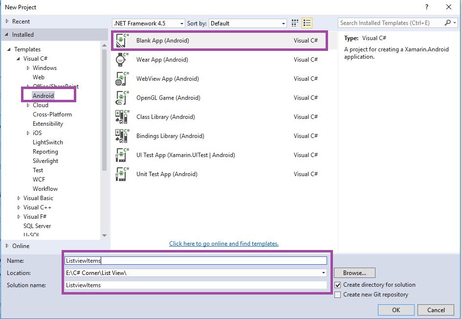Open Visual Studio, New Project, Templates, Visual C#, Android, then Blank App (Android)