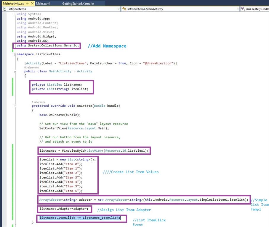 Here, first we add Namespace and then declare variables of ListView items. Go to OnCreate(), create the ListItem Values, then add  in Adapter.