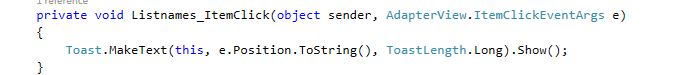 Create ListItemClick Event: listnames.ItemClick += Listnames_ItemClick;