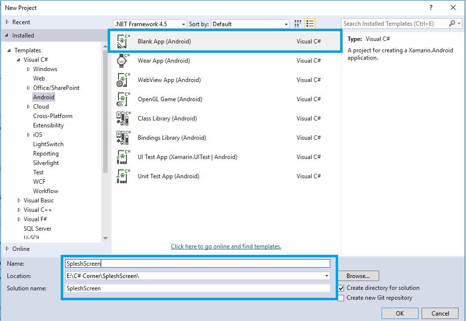Open Visual Studio, New Project, Templates, Visual C#, Android, Blank App, then select Blank App (Android). Then give Project Name and Project Location.