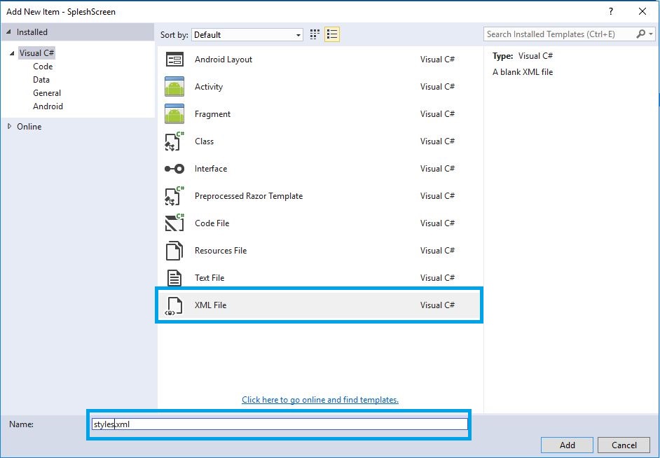 Next go to Solution Explorer, Project Name, Resources, Values. Right Click to Add->New Item, then open new Dialog box. After that select XML File and then give name for styles.xml.