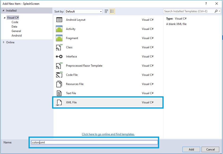 Again go to Solution Explorer, Project Name, Resources, Values then Right Click to Add->New Item. Open new Dialog box and then that dialog box to select XML File. After that give name colors.xml.