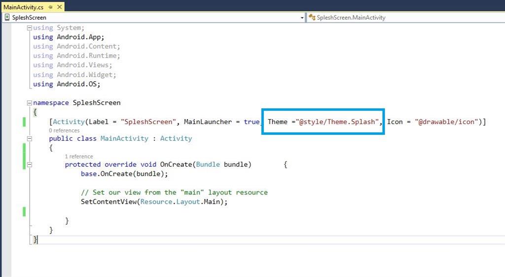 Next open Solution Explorer-> Project Name->MainActivity.cs Click Open C# Code. Then give already we created theme name here.