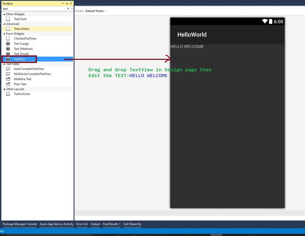 Step 6 - Next Open Main.axml Remove the old BUTTON then Drag and Drop New TextView. Then Edit the TextView Text in HELLO WELCOME,