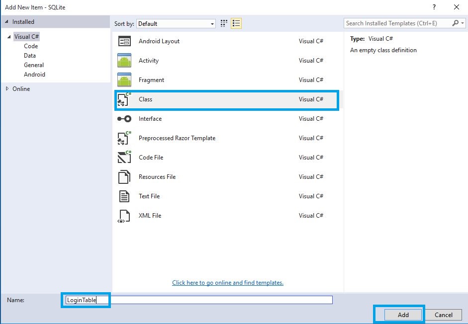 Next, we need to create the database table, so we create one Data Layer class. Go to Solution Explorer-> Project Name. Right click to Add. Open new dialog box. Select Class, give name for LoginTable.cs and after it, add New Class.