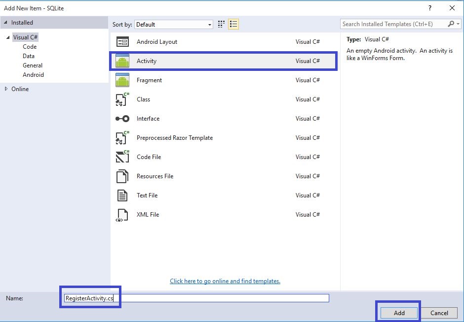 Go to Solution Explorer-> Project Name. Right click on Add. Open new dialog box. Select Activity and give name for RegisterActivity.cs. Now, add the New Activity Class.