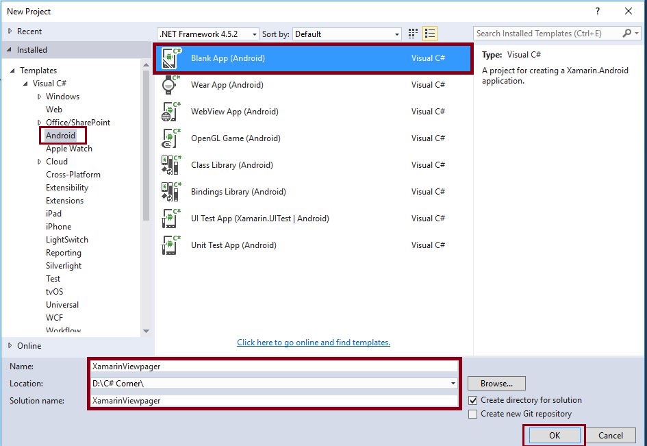 Step 1: Open Visual Studio->New Project->Templates->Visual C#->Android->Blank App.