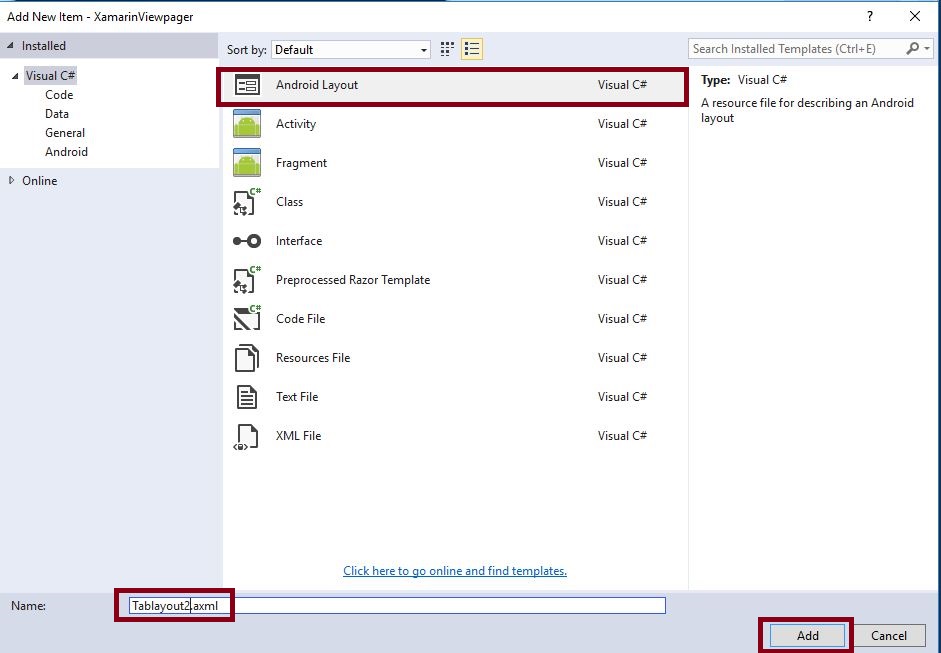 Go to Solution Explorer-> Project Name->Resources->layout. Right click to Add->New Item and open a new dialog box. Then, select Android Layout and give it a name as Tablayout2.axml.