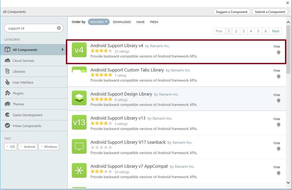 Next, go to Solution Explorer-> Project Name-> Components and right click to get More Components. Open a new dialog box. Use this dialog box to search the Support v4. Then, add the Android Support Library v4 packages.