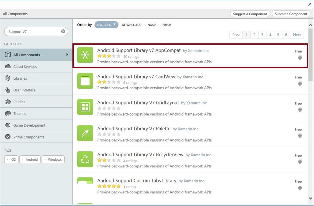 Next, go to Solution Explorer-> Project Name-> Components. Right click to get more components and open a new dialog box. In this dialog box, search the Support v7. Then, add the Android Support v7 AppCompat packages.