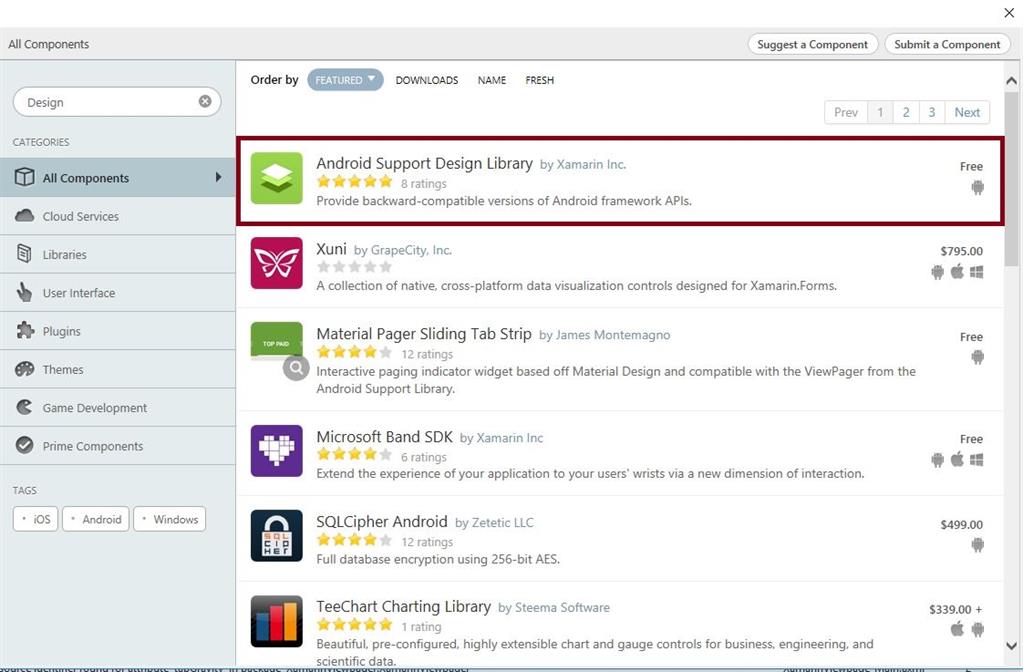 Next, go to Solution Explorer-> Project Name-> Components. Right click to get more components and open a new dialog box. In this dialog box, search for the Design. Then, add the Android Support Design Library packages.![]()