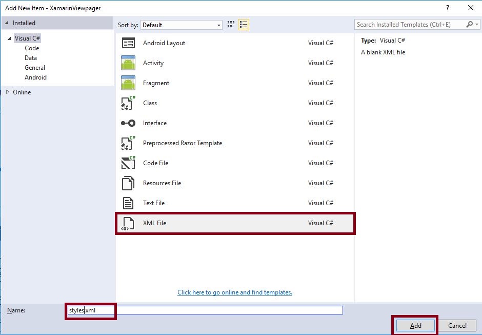Next, we need to create color.xml file. Go to Solution Explorer-> Project Name->Resources->values. Right click to Add->New Item. Then, open a new dialog box. Selet an xml file and name it as colors.xml.