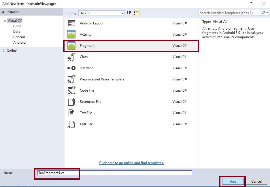Go to Solution Explorer-> Project Name. Right click to Add->New Item and then, open a new dialog box. Then, select Fragment and name it as TabFragment1.cs.
