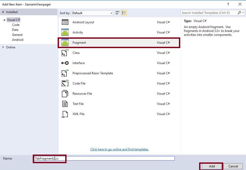 Go to Solution Explorer-> Project Name. Right click to Add->New Item and open a new dialog box. Then, select Fragment and give it a name as TabFragment2.cs.