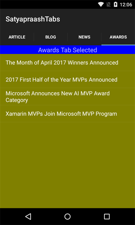Before we can add the tab however, we need to handle the TabSelected event. In this handler, we can create the content for the tab. Action Bar tabs are designed to work with