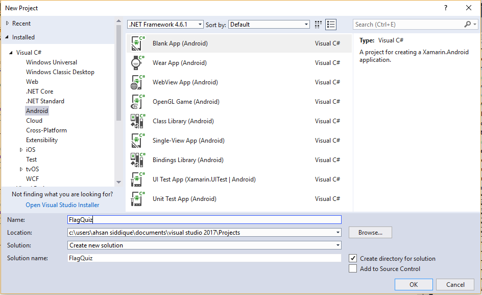 You can create a new Xamarin.Android app by going to File ->>Visual C#-> Android-> Blank app. Give it a name like, FlagQuiz.