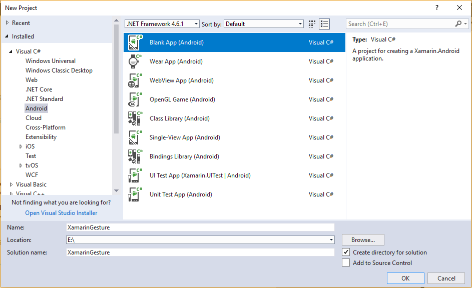 Open Visual Studio and go to New Project-> Templates-> Visual C#-> Android-> Blank app. Give it a name like XamarinGesture.