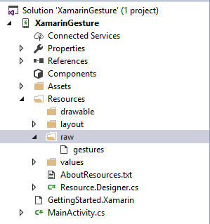Now, copy the gestures file from your local folder with the name "0" and go to Solution Explorer-> Project Name-> Resources. Right-click to create a new folder, give it a name like Raw, and paste the gesture file in it, as shown in below screenshot.