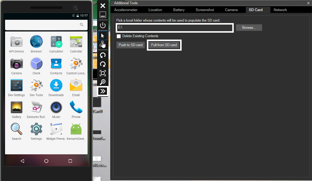 Step 3After creating some gestures in Gesture Builder, click on emulator double arrow and go to Emulator Tools -> Additional Tools -> SD card. Pick a local folder whose content will be used to populate the SD card and give it a new location.
