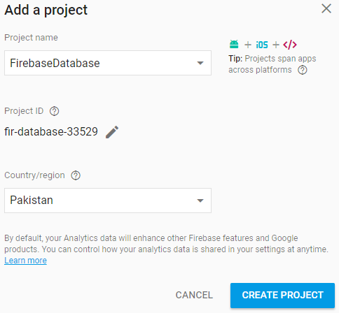 "https://console.firebase.google.com/u/0/", then go to the console and click on Add Project. Enter Project name and Country as shown below and then click on "Create Project".
