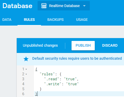For this, go to Firebase console and select your project. Now, click on Database and then select RULES tab. Replace the following code with Firebase Database Rules and hit "Publish" button.