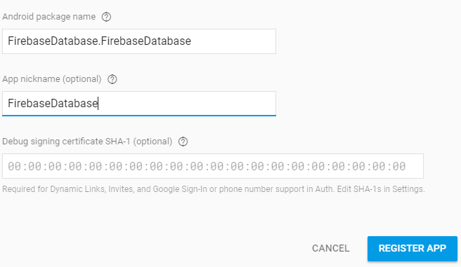 Now, click on ‘Add Firebase to your Android App’ and copy the package name of your app followed by a click on Register App. All other fields are optional and can be left blank for now.