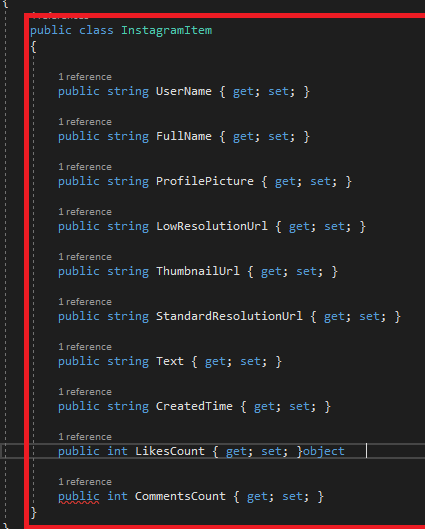 Create a class named InstagramItems inside the Models folder. For that, go to Solution Explorer >> Instagram(PCL) >> right click and select new item. In the popup window, select Cross platform >> class. Give the class name Instagramitem. Double click to get into its design view and insert the code given below.