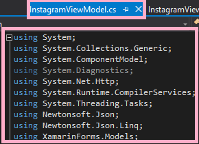Now, we need to add namespaces. For that, go to Solution Explorer >> Instagram(PCL) >> click open InstagramViewModels page design view and add the following namespaces.