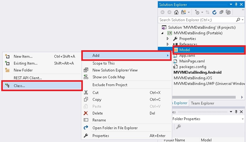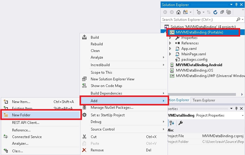 Next, go to Solution Explorer >> Project Name (Portable), then right-click to Add >> New Folder. It opens a new dialog box; give the name to your Model.