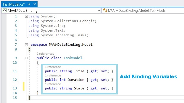 Next, open Solution Explorer >> Project Name >> Model >> TaskModel.cs. Click to open C# code. Then, give the following code.