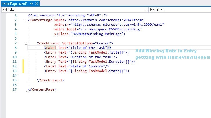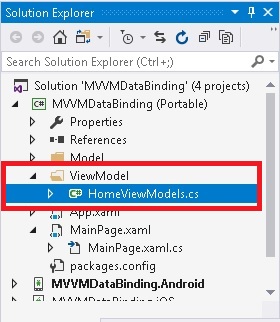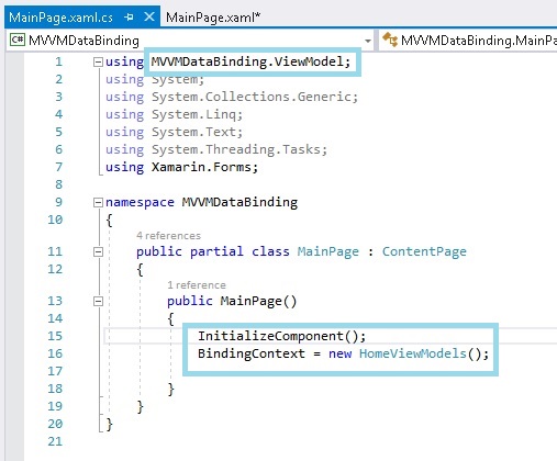 Next, open Mainpage.axml.cs Page, then add namespace MVVMDataBinding.ViewModel, and give the following C# code.