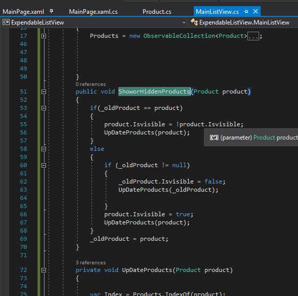 This article demonstrates how to create an Expandable ListView of items in Xamarin.Forms application. If the user clicks on a product, that product expands and shows items. Then, the user clicks on the same product twice and it will be hidden.