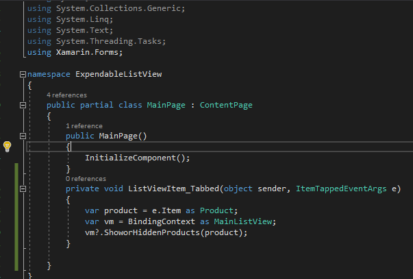 Now, open Solution Explorer >>ExpendableListView(PCL) >>open MainPage.xaml.cs page. Here is the code for this page.