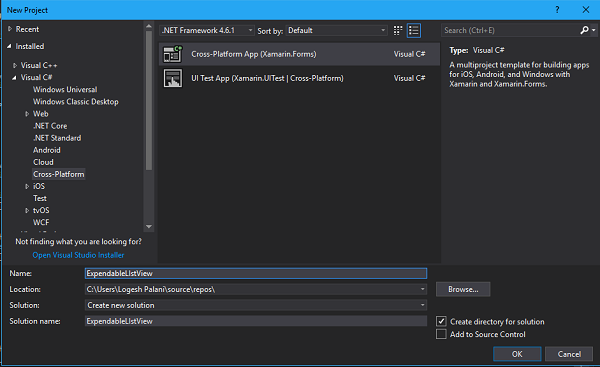 Create a new Xamarin.Forms app by going to File >> New -->> Visual C# >> Cross Platform >> Cross Platform App (Xamarin.Native or Xamarin.Forms), give the application name, and press OK.