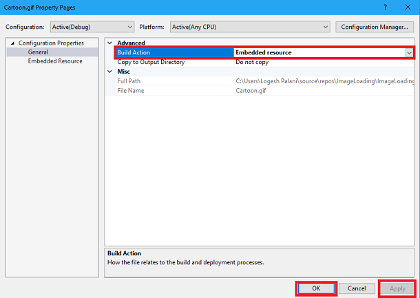 After this, let's change the picture properties to embedded resource. For that, go to Properties window >> Advanced >> Build Action >> select Embedded Resource.