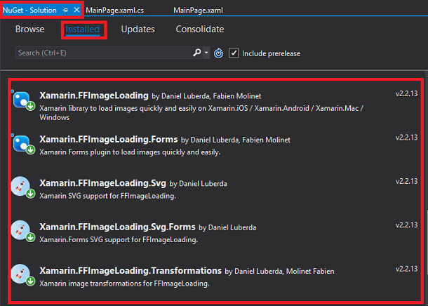 For that, open Solution Explorer and select your solution. Right-click and select "Manage NuGet Packages for the Solution". In the popup window, open "Browse" tab and browse "Xamarin.FFImageLoading.Forms" and select the following NuGet packages and select yours then install it.