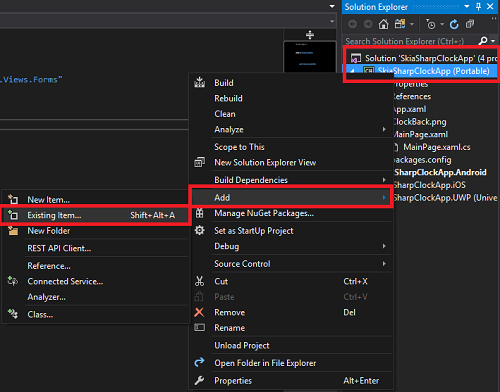 Afterwards, add GIF, SVG, pictures. For that, open Solution Explorer >>right click and select Add followed by selecting Existing Items.