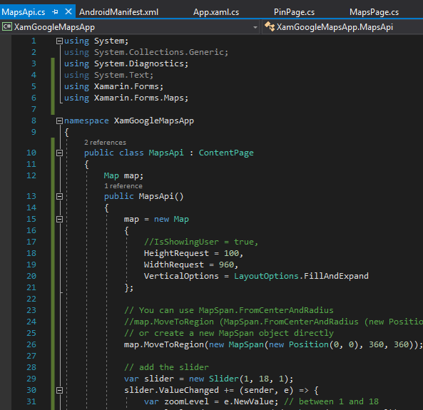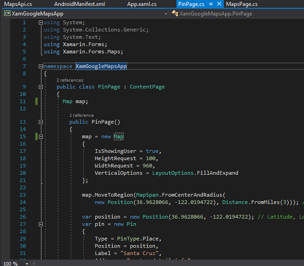 After the design view creation, open Solution Explorer >> XamGoogleMapsApp(PCL) >>App.xaml.cs and double-click to get its design view and copy and paste the below-given code.