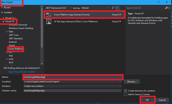You can create a Xamarin.Forms app by going to File >> New >> Visual C# >> Cross Platform >> Cross Platform App (Xamarin.Forms or Xamarin.Native) and click OK.