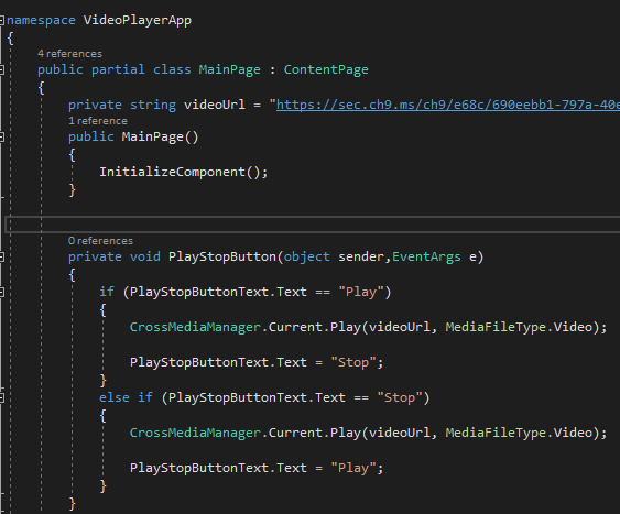 Next, open Solution Explorer >> VideoPlayerApp(PCL) >> MainPage.xaml.cs page and double-click to open its design view. The code is given below.