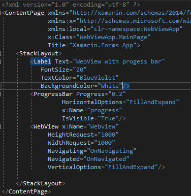 This opens the WebView and ProgressBar control to your MainPage.xaml page. For that, Solution Explorer >> WebViewApp(PCL) >>MainPage.xaml and double-click to open its design view. Here is the code.